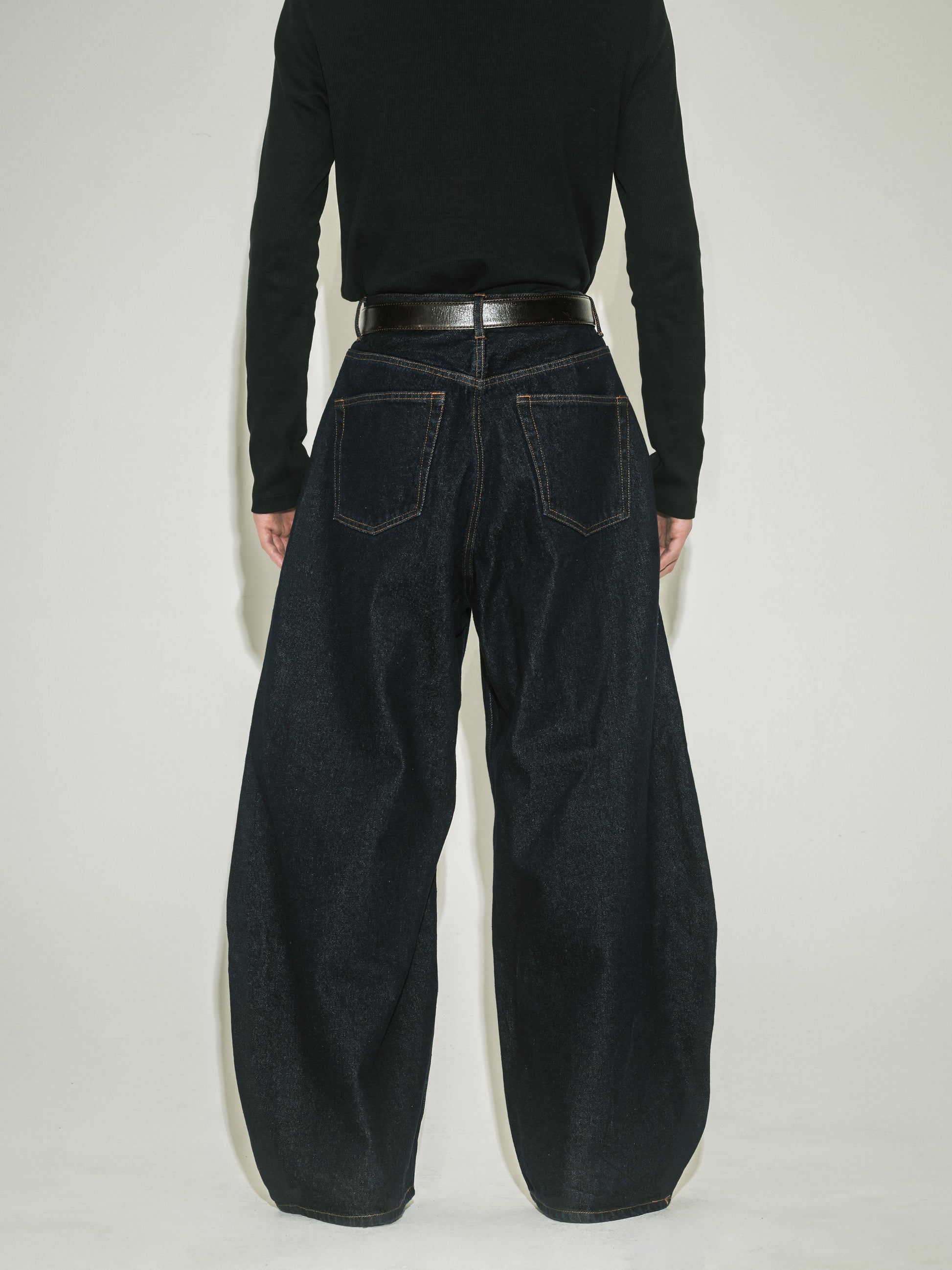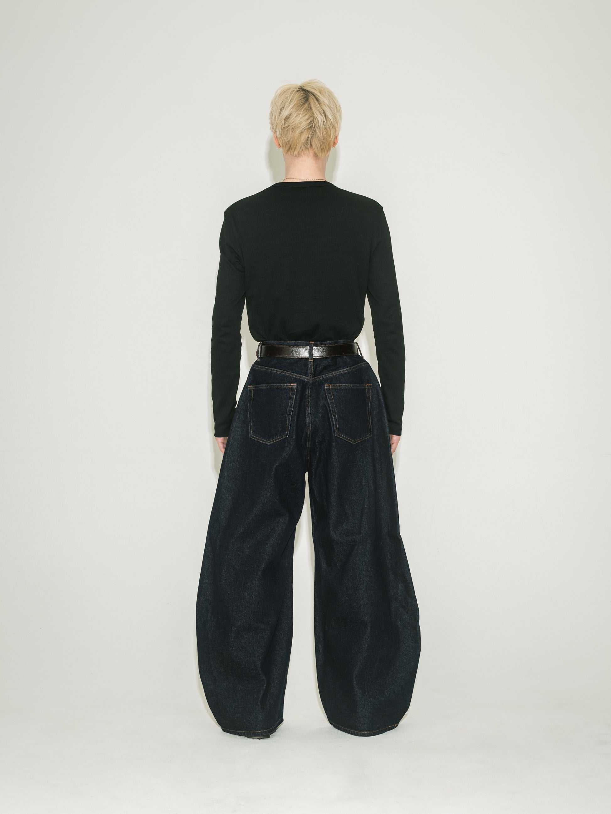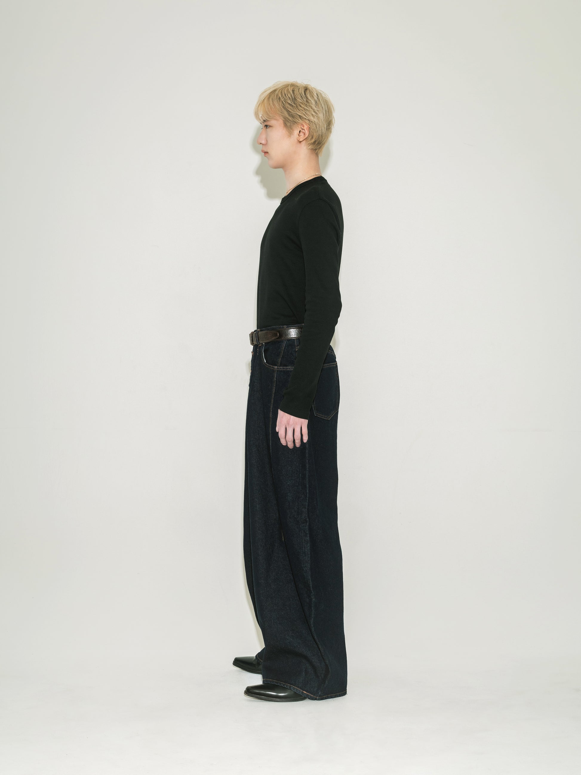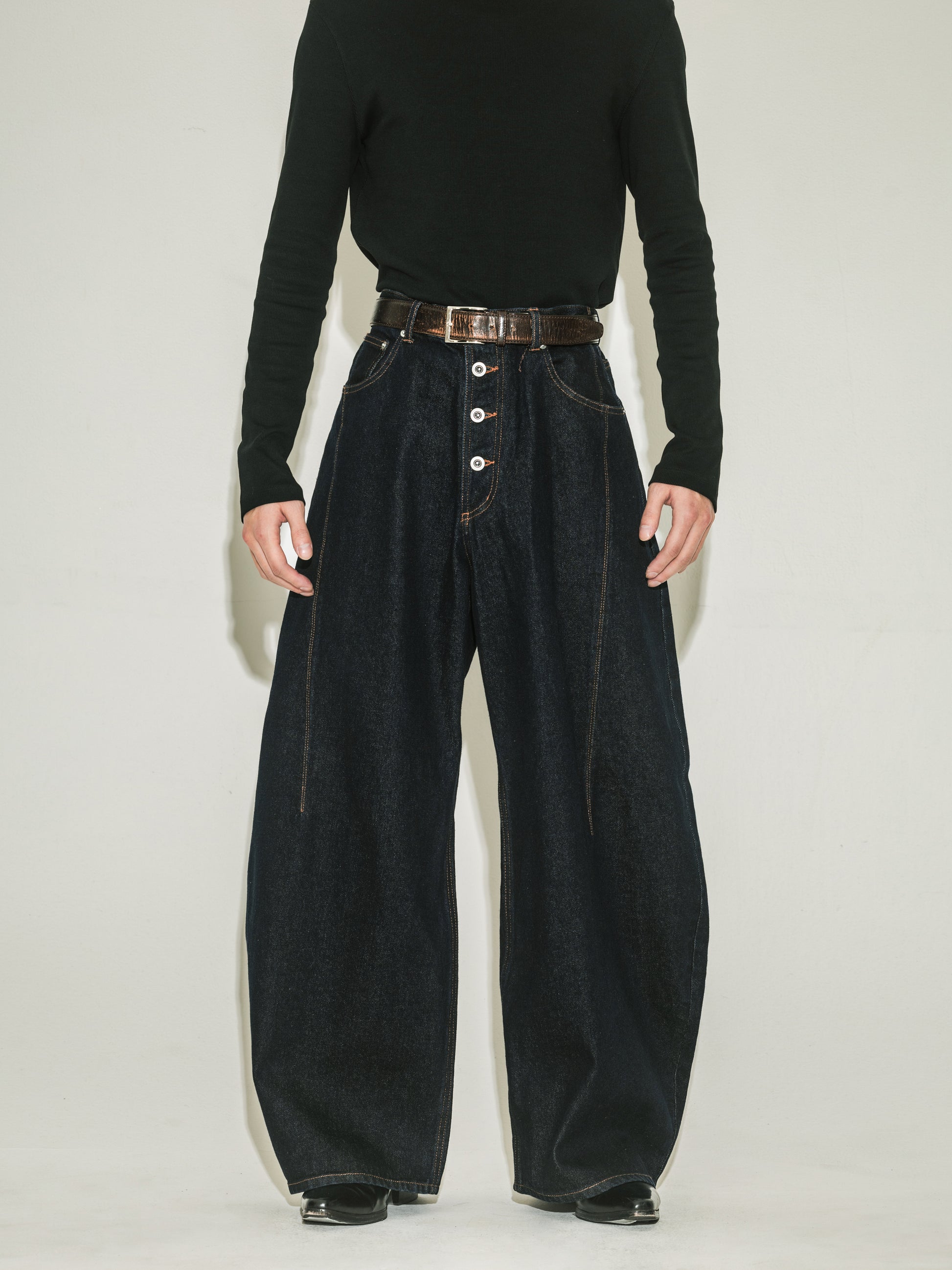 輪郭と構造を明確に定義することで、ワイドシルエットを成立させたデニムパンツ。