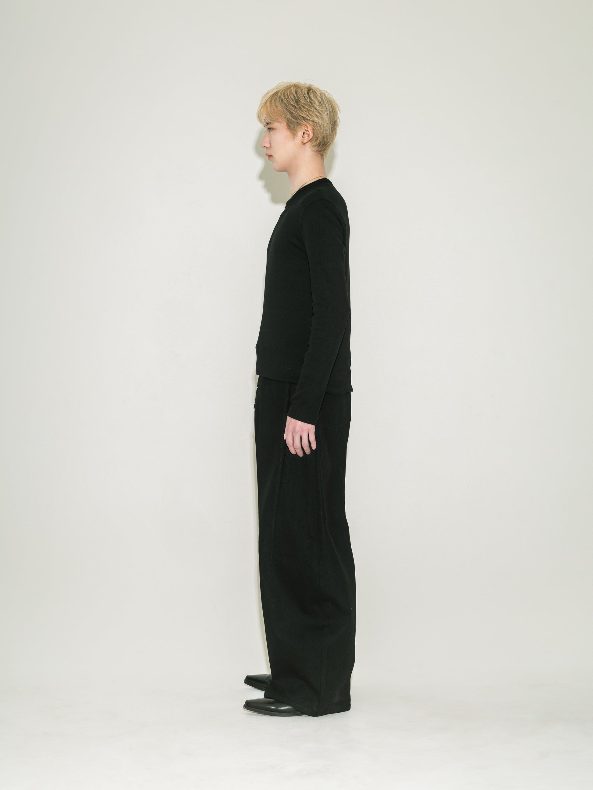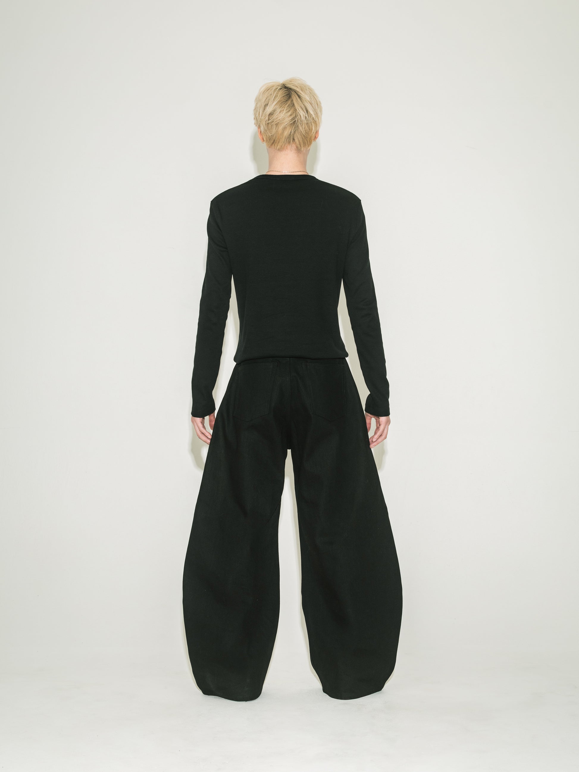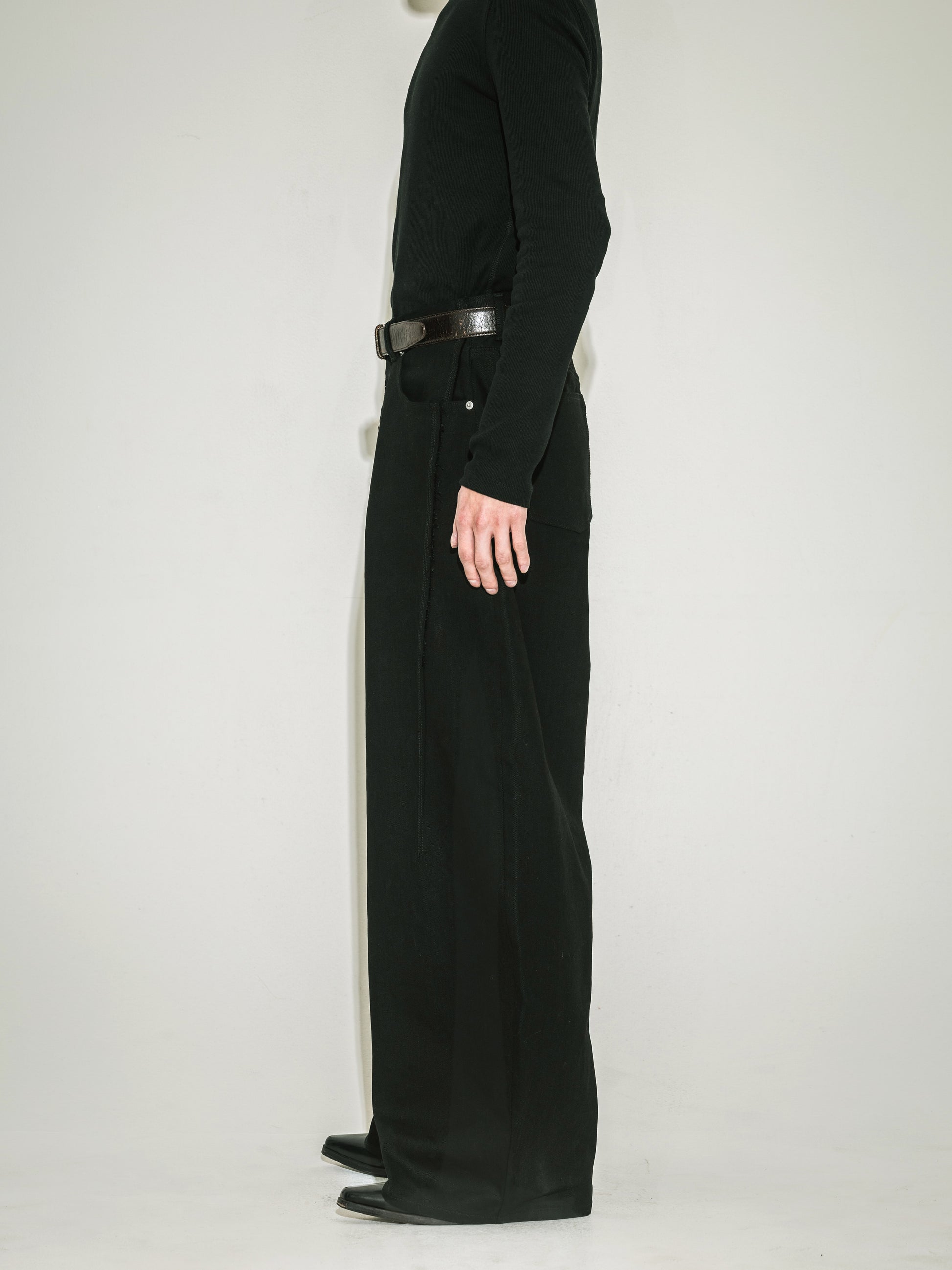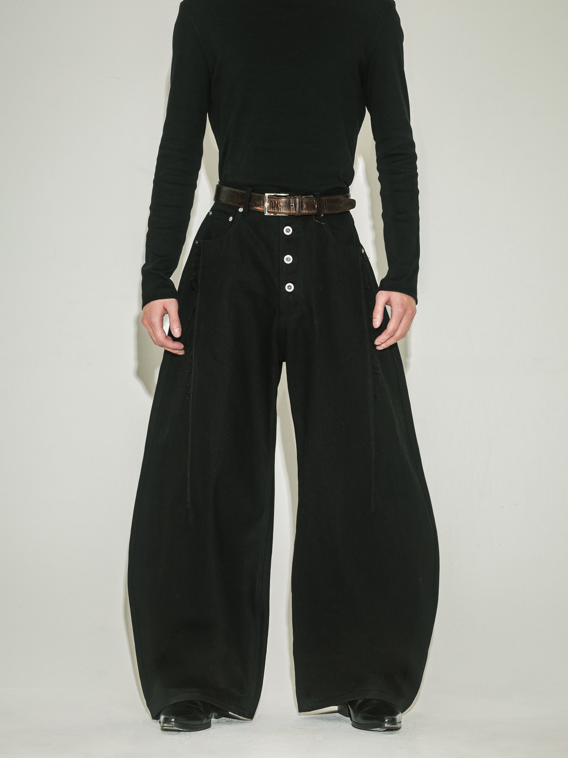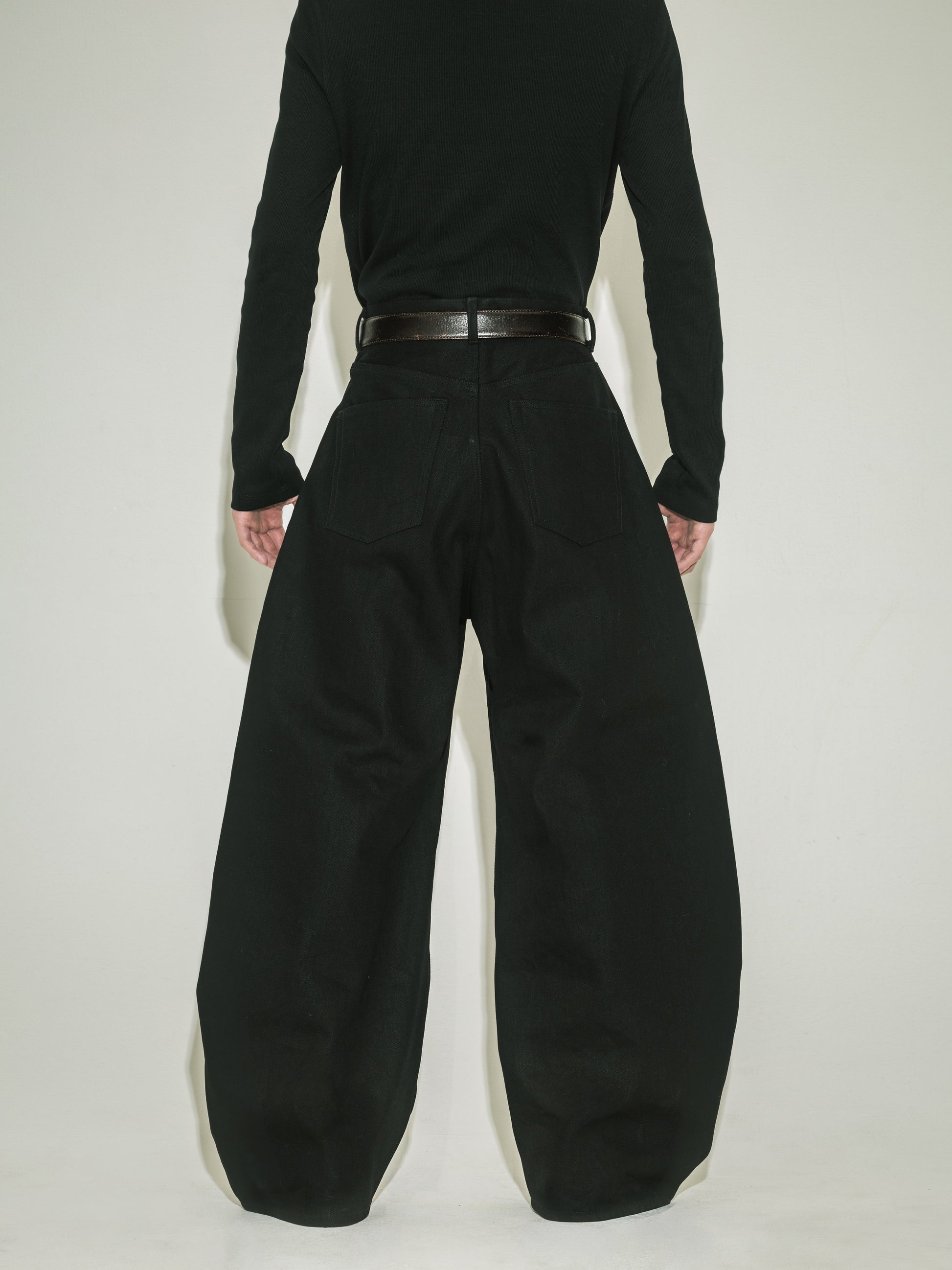 輪郭と構造を明確に定義することで、ワイドシルエットを成立させたデニムパンツ。